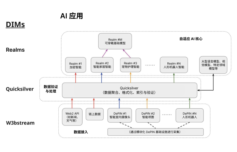简而言之,Real-World AI 技术栈由三大核心层构成:数据接入层(Data Ingestion Layer)、数据验证与处理层(Data Verification & Processing Layer)、以及自适应 AI 核心层(Adaptive AI Core Layer)。通过引入 DIMs (DePIN Infrastructure Modules),这三层协同运作,形成一条高效、可信且持续的数据通路,确保来自现实世界的多源数据能够安全、顺畅地接入 AI 模型与应用,为 Real-World AI 的智能演化提供坚实的数据基础。
