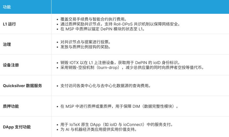 在 DePIN 生态系统中,IOTX发挥着多重功能,支持区块链的运行并保障多个关键用例的安全与激励,包括: