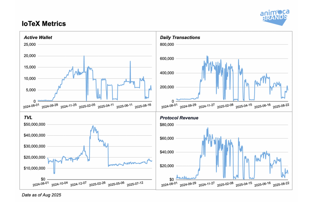 截至 2025 年 8 月底,IoTeX Layer 1 主链的总锁仓价值(TVL)已达到 1,630 万美元,有 35.5 亿枚 IOTX 代币参与质押,占总代币供应量的 37.8%。
