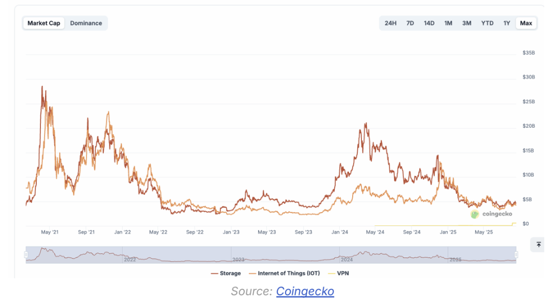 下方图表展示了DePIN不同细分赛道,包括存储(Storage)、物联网(IoT)、VPN 等在不同时期的市值规模与市场占比变化趋势。