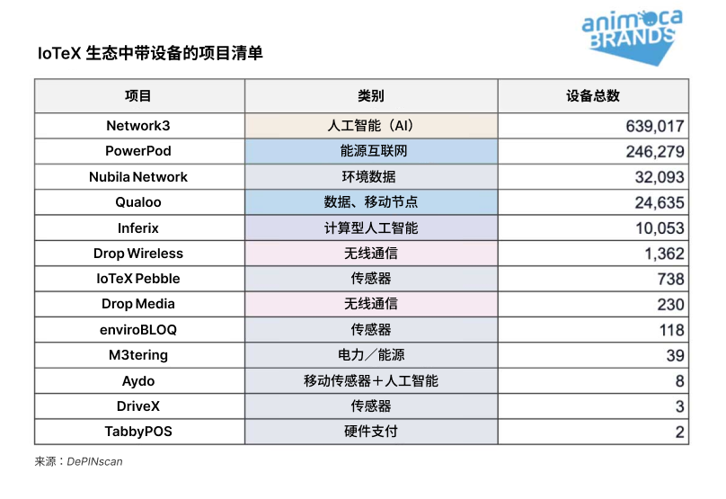 截至 2025 年 8 月,据 DePINscan 数据显示,IoTeX 链上共有 958,271 台活跃设备 ,来自 13 个项目 (其中 12 个为独立生态项目) 。这些智能设备覆盖多个行业场景,持续生成高价值的现实世界数据,为构建更具适应性、可信度与现实影响力的新一代 AI 模型与应用提供了坚实的数据供应与基础设施。