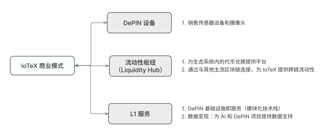IoTeX 的核心定位是一套去中心化的技术与生态体系,致力于将物理世界中的设备(如物联网传感器、摄像头、机器人等)与区块链深度连接,构建可信的数据基础设施。其商业模式主要建立在三大收入支柱之上:设备销售、流动性枢纽(Liquidity Hub)以及 Layer 1 基础设施服务。