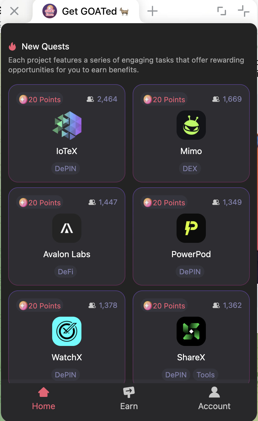 在telegram进入 Telegram: View @GoatEarnApp ,完成基础任务、每天签到可以赚Points。