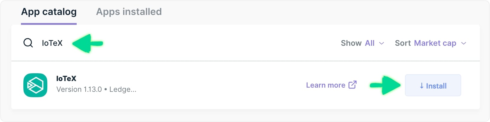 In Ledger Live "Manager" section, select the “App Catalog” tab, find “IoTeX” among the apps and click the “Install” button next to it: