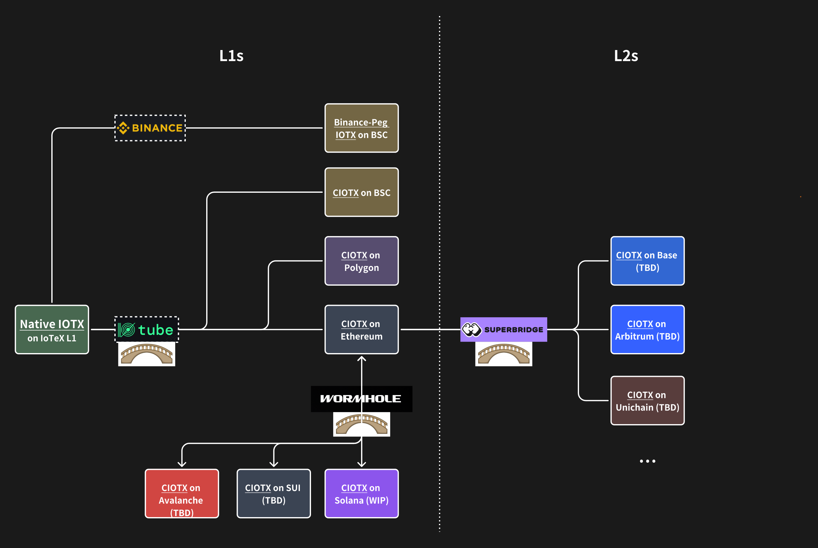 CIOTX (Crosschain IOTX): A bridge-based version of IOTX deployed on multiple chains (Polygon, BSC, Ethereum) for cross-chain functionality.