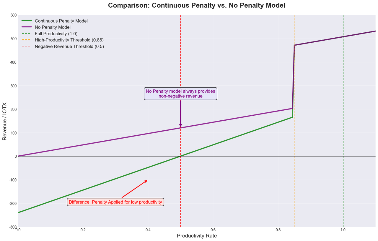 The formula creates a “cliff” at the under_productivity_threshold mark. As shown in the chart below, revenue drops significantly once a delegate’s productivity falls below this threshold, making it economically irrational to operate an unreliable node.