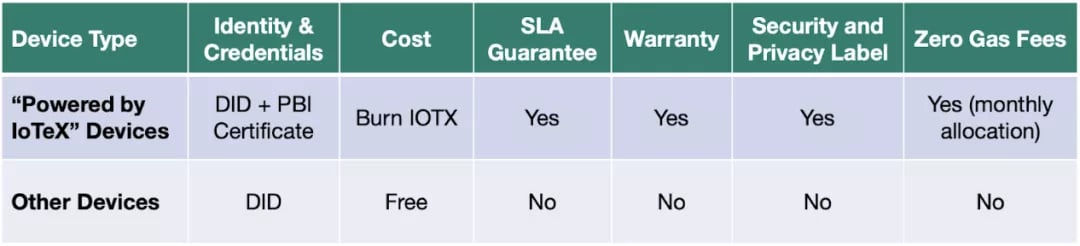 Ucam作为首款“由IoTeX赋能”的创新型物联网设备,配备了IoTeX的各种功能,如DID、安全存储、电子钱包等,赢得了用户的广泛好评。未来,设备制造商还将通过销毁一定数量IOTX为设备配置PBI(Powered by IoTeX)证书,这是一种特殊类型的、颁发给DID设备的可验证凭证,允许设备访问特定的“由IoTeX赋能”的服务和功能。如下表所示,拥有PBI的设备可以获得服务水平协议(SLA, service level agreement)保证、去中心化担保、安全与隐私标签、零燃料费(每月有一定的限额)等功能。我们将在通证经济学的第2篇公告中详细介绍PBI证书与IOTX通证销毁的更多信息。