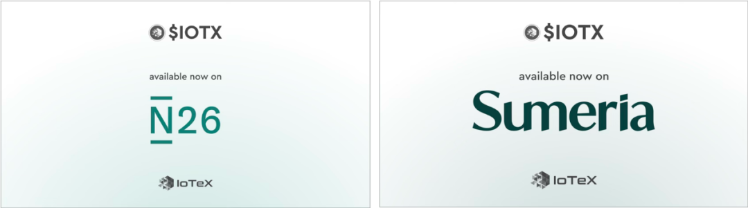N26 Crypto (9 月 5 日):IOTX 正式上线欧洲领先的移动银行 N26。该平台覆盖 24 个国家,拥有超过 800 万用户,支持用户在 App 内便捷地买入、卖出与兑换 IOTX,可实时追踪资产表现,并享受更低的交易手续费。此次上线进一步强化了 IoTeX 在受监管的欧洲金融市场中的品牌影响力与合规布局。
