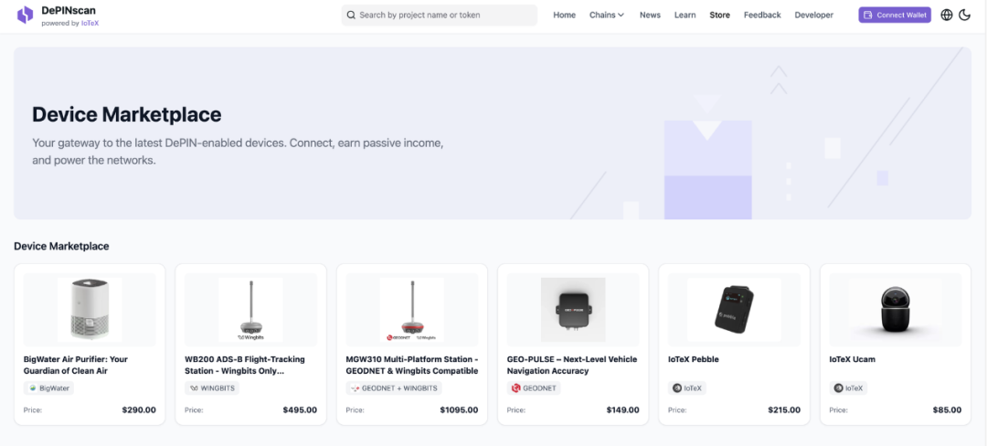 DePINscan 设备商城:全新上线的 DePIN 设备交易平台,用户可便捷购买高收益的硬件节点设备,包括 GEODNET 的 GEO PULSE 与 MGW310 基站、Wingbits 的 WB200 ADS-B 飞行追踪器、BigWater 的空气净化器,以及 IoTeX 自研产品 Pebble Tracker 与 Ucam。