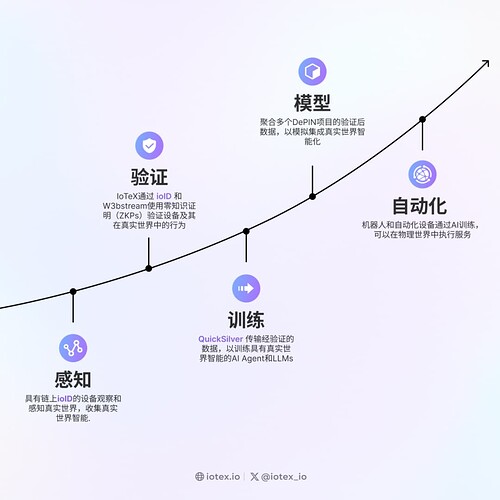 IoTeX 多年来的工作主要集中在“感知”和“验证”环节,ioID 和 W3bstream 现已使开发者能够将现实世界的设备连接到区块链,并利用零知识证明验证其真实活动。2025年,IoTeX 将对 DePIN 模块化平台进一步扩展,并推出新的基础设施,使开发者能够在 DePIN 价值链的“训练”->“建模”->“自动化”阶段进行创新。这将催生一波全新的自主应用,将现实世界数据与先进的AI能力相结合。