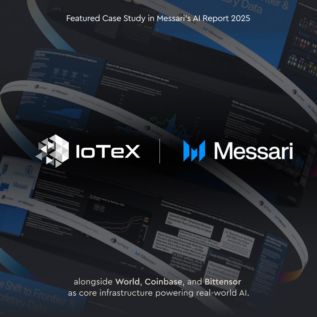 与此同时,来自第三方的研究也进一步印证了 IoTeX 的战略定位。Messari 的“人工智能现状报告 (State of AI Report)”将 IoTeX 作为核心案例列入其中,指出当前 AI 技术栈在基础层面存在“可验证现实世界数据”的空缺,而 IoTeX 是为数不多尝试在系统层解决该问题的区块链平台之一。