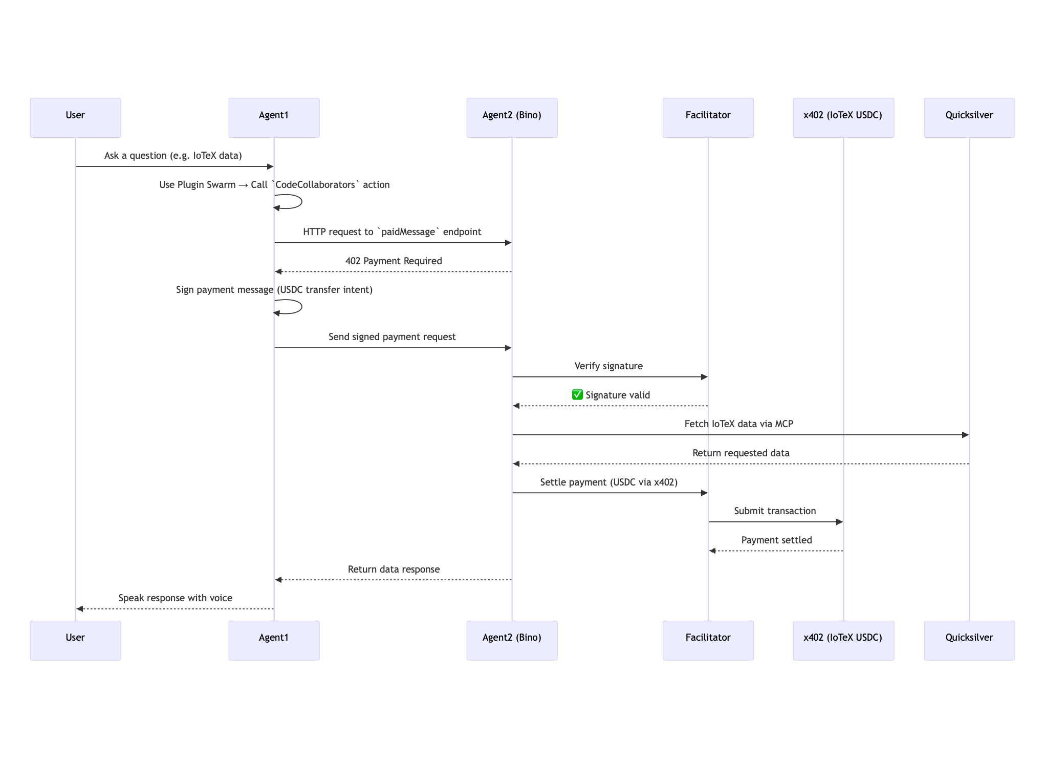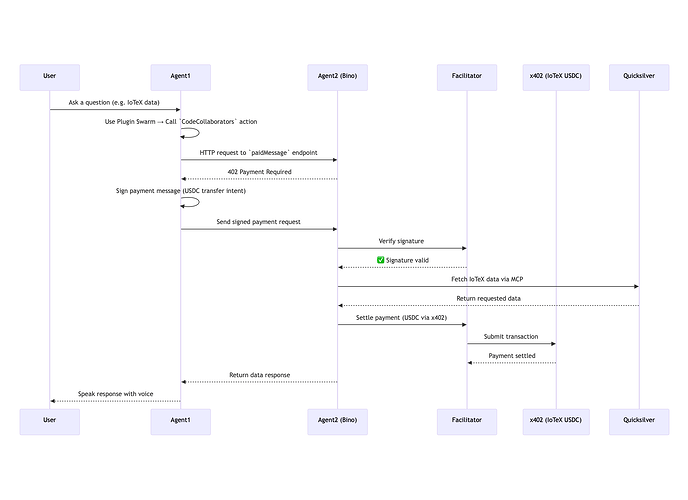 These agents experimentally collaborate using the x402 protocol, enabling machine-to-machine payments in USDC settled on the IoTeX L1 when agents outsource requests to one another. For example, Bino pays Caila when weather data is needed for a certain request, and vice versa: