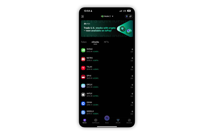 We integrated xStocksFi into ioPay, enabling users to access synthetic stock assets such as $TSLAX, $NVDAX, and $MSTRX directly from their wallet. This feature adds a new layer of financial utility to the IoTeX ecosystem by bridging DeFi and real-world asset exposure on-chain.