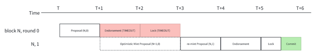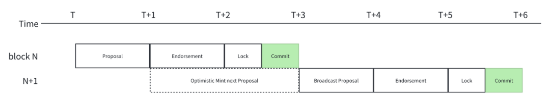 当某一区块(第 1 阶段)刚被提议时,下一个提议者就会立即开始准备下一个区块(第 2 阶段) ,即便当前共识轮次尚未结束。