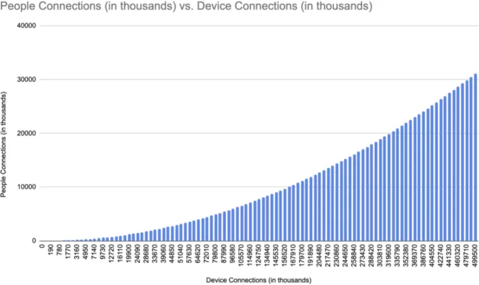 根据梅特卡夫定律,如果IoTeX网络上有100万台智能设备,那么彼此之间就会产生超过5000亿条不同的连接路径。随着网络连接的指数级增长,有效的网络连接数量也将随之上升,为社区之间的合作共赢奠定了坚实基础。上链的智能设备越多,IoTeX网络的价值就越大。当智能设备数量达到一定的量级之后,网络规模效应将会带来指数级的效用增长。