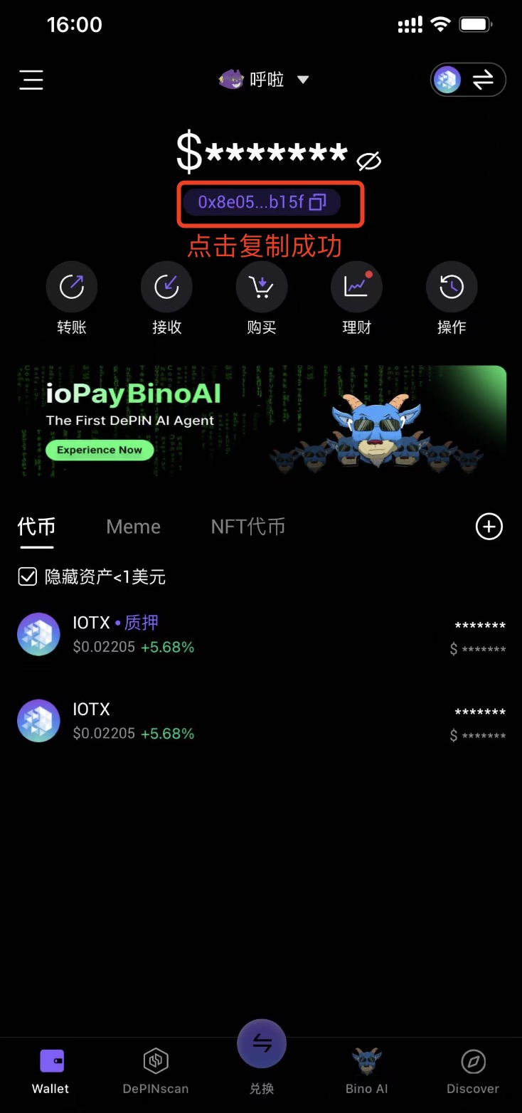 可以在各大交易所(币安、Bitget、gate等)购买一些IOTX通证,然后发送到上面复制的地址。