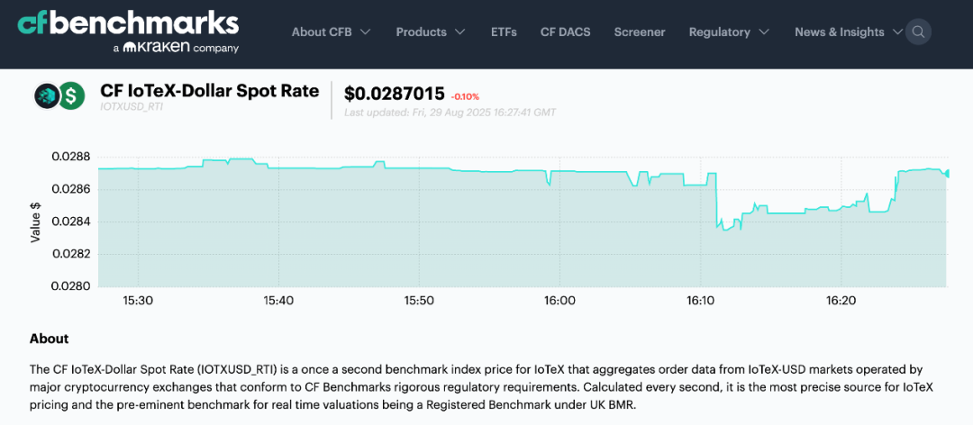 认可度与可信度 :与芝商所、贝莱德、富达等主流机构信赖的同一家基准提供商对接,极大增强了机构层面对 IOTX 的认可度。